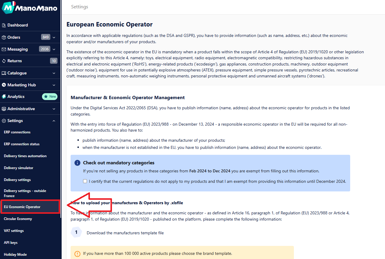 - 制造商:在ManoMano工具箱的"设置" > "EU经济运营商"中输入您的产品制造商的名称和地址。