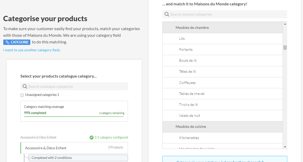 Applicable products: Netmarkets Maisons du Monde (Mirakl) - 类别 在类别匹配步骤中,将您自己的类别与Maisons du Monde类别进行匹配。 更新 2024年05月23日 08:11