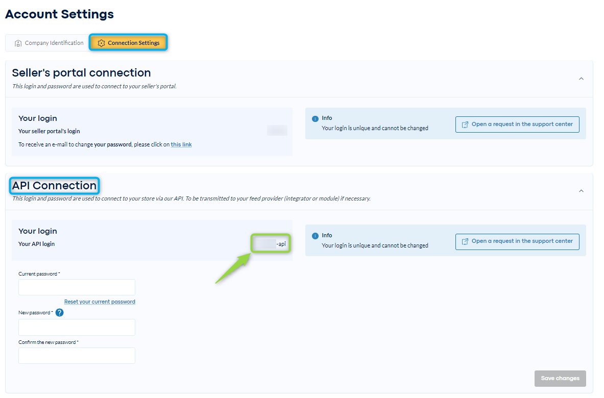 - 将此临时密码更改为在此选项卡中更合适的一个(连接信息 > 更改您的API连接设置 > 密码)。