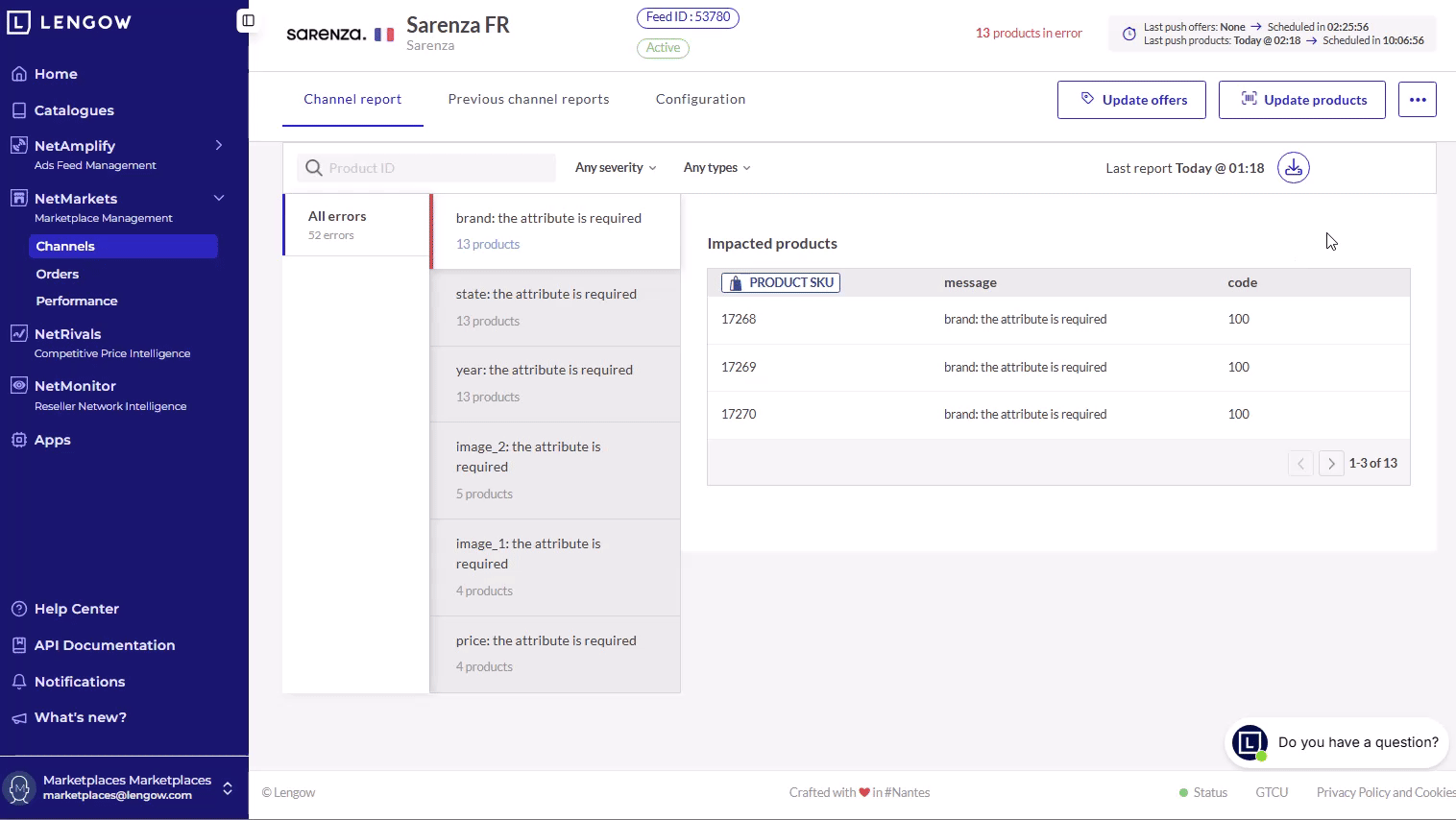 Applicable products: Netmarkets, Netamplify 💡 如何禁用渠道? 要在Lengow上禁用(临时或永久)渠道,请按以下步骤操作:1. 选择您想要禁用的渠道进入“渠道”,选择要禁用的渠道: 2. 点击“更多操作”-> “暂停此渠道” -> “禁用”要重新启用该渠道,点击“更多操作”-> “激活此渠道”禁用后,如有需要,您可以永久删除该渠道——但您将丢失所有设置和数据。操作方法是,点击“更多操作”-> “删除此渠道”,然后输入“I AM SURE”。 更新 2025年09月25日 14:37